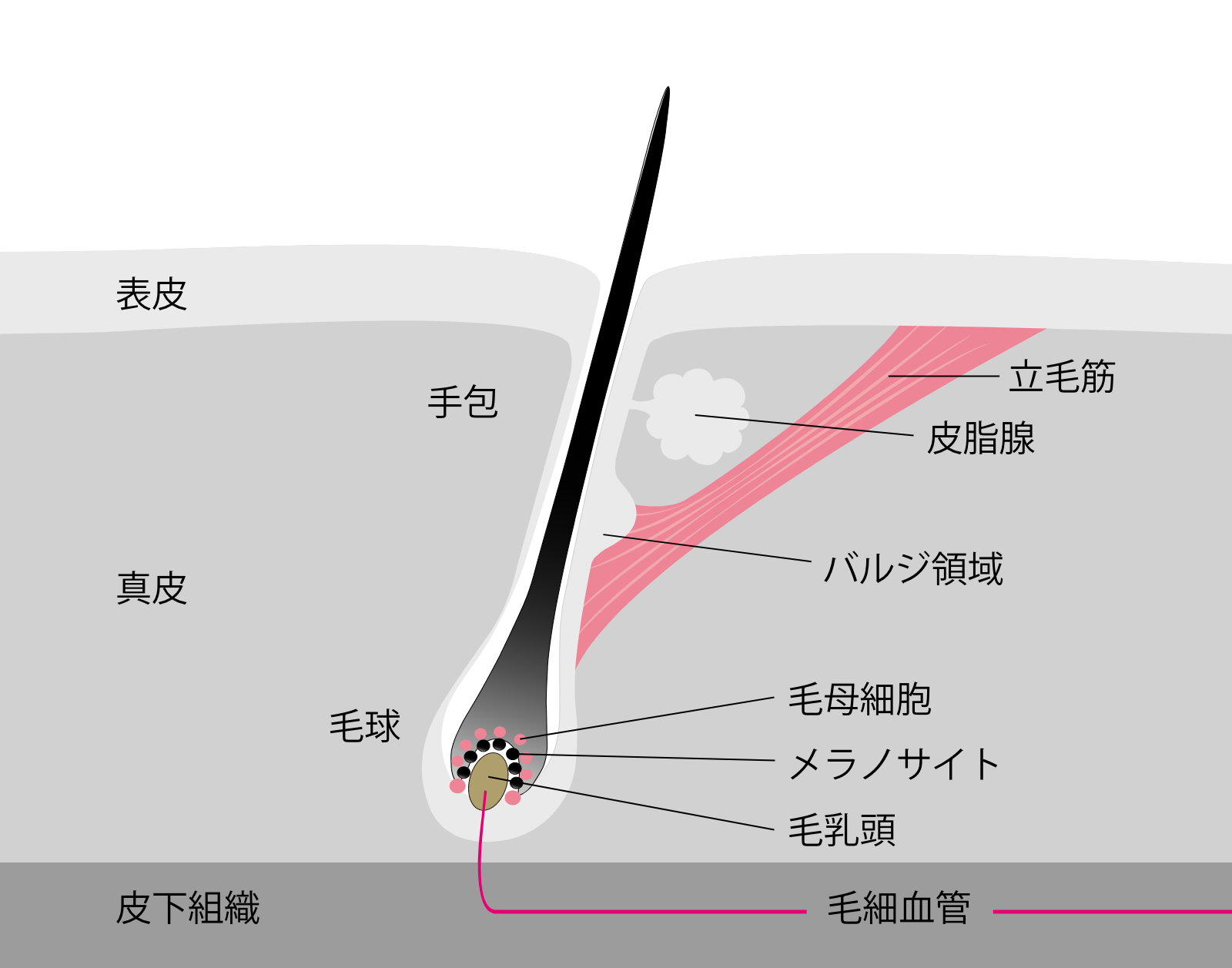 皮膚の内部で毛幹を包んでいる部分全体を毛包と呼び、立毛筋の付着部をバルジ領域と呼びます。