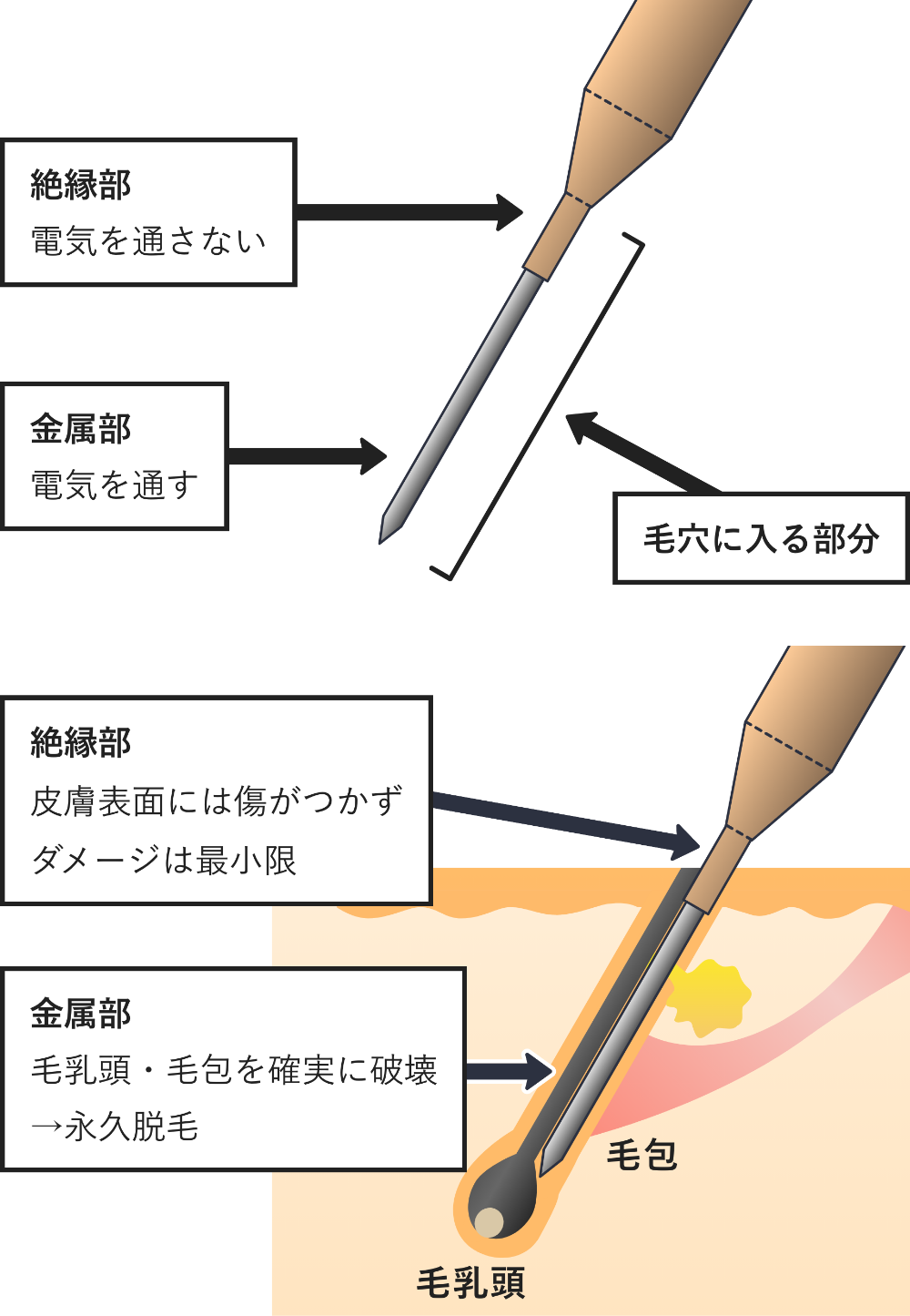 針脱毛の仕組みは毛穴に針を入れて電気を流すという単純なものですが、普通の針でこれを行うと皮膚がヤケドしてしまいます。そこで医療機関では絶縁針という特殊な針を使用します。 絶縁針とは字の通り「絶縁された針」のことです。どこが絶縁されているかというと、毛穴に挿入した時に皮膚表面に触れる部分が絶縁されていて、皮膚の表面には電気が流れないようになっています。 このような特殊な針を使うことによって皮膚表面には傷をつけずに毛根組織だけ破壊することができます。